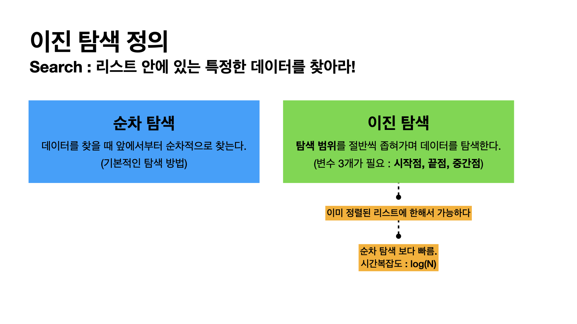 이진 검색 알고리즘(binary search algorithm)은 오름차순으로 정렬된 리스트에서 특정한 값의 위치를 찾는 알고리즘이다. 처음 중간의 값을 임의의 값으로 선택하여, 그 값과 찾고자 하는 값의 크고 작음을 비교하는 방식을 채택하고 있다. 처음 선택한 중앙값이 만약 찾는 값보다 크면 그 값은 새로운 최댓값이 되며, 작으면 그 값은 새로운 최솟값이 된다. 검색 원리상 정렬된 리스트에만 사용할 수 있다는 단점이 있지만, 검색이 반복될 때마다 목표값을 찾을 확률은 두 배가 되므로 속도가 빠르다는 장점이 있다. - 위키백과